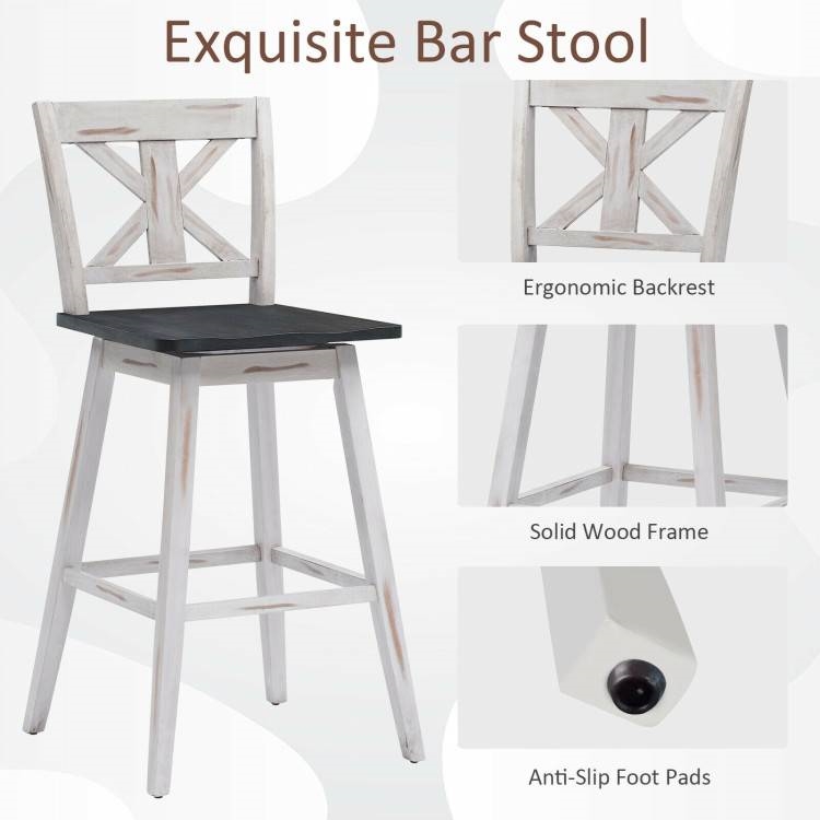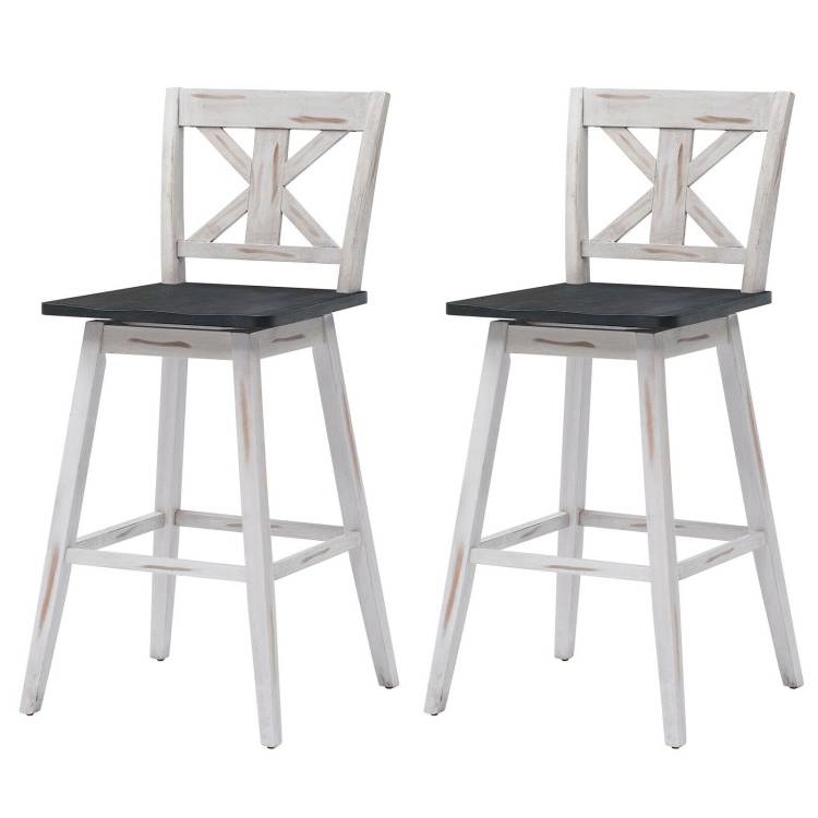 This Set of 2 White Wood 29-in Modern Kitchen Dining Farmhouse Swivel Seat Barstools is made of premium rubberwood and features excellent sturdiness and durability. Therefore, the overall weight capacity of each bar stool has been improved to 214 lbs and you can use the set for a long time. The backrest is designed to be ergonomic and can perfectly fit your back lines. Meanwhile, the seat of the barstool also adopts a curved design, fitting your hips. In this way, your body will be well supported and fatigue can be relieved. Even sitting for a long time you will not feel very tired. The special thing is that the seat is a 360° swivel and you can spin quietly. Thanks to this feature, you can talk to your guests in different directions conveniently. Moreover, there are 2 bar stools in this set, which can meet your daily needs. In addition to your home kitchen, the bar stool set can also be placed in restaurants, bars, and bistros. Meanwhile, with a vintage design, the bar stools can also become a wonderful decoration. The set will bring a sense of fashion and freshness to your home. All needed manuals and accessories are included in the package. With these necessary tools, you can easily assemble the bar stool set. The overall dimension of each stool is 20" x 20" x 43" (L x W x H) and the seat is 29" high. During daily life, you only need to wipe it with a damp cloth regularly.