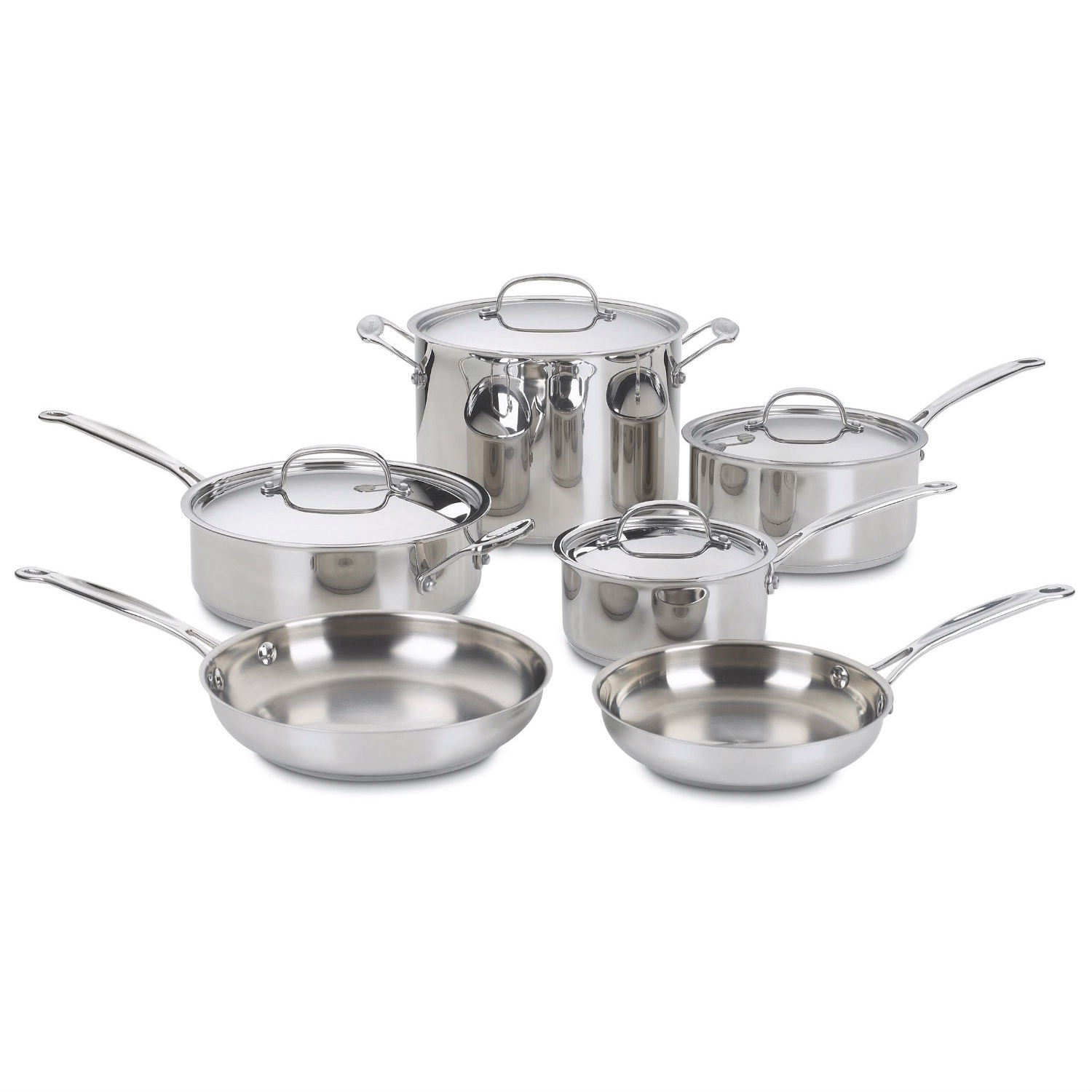 Inspired by the great French kitchens, this 10-Piece Stainless Steel Cookware Set would be a great addition to your home. Constructed of the finest materials available, to perfectly perform all of the classic cooking techniques. Designed to last a lifetime, Cuisinart cookware makes family meals memorable and entertaining a pleasure. Savor the Good Life right at home, with family and friends. Cuisinart makes it absolutely delicious. The set is an investment that will prove its worth every time you use it. Exclusively designed aluminum encapsulated base provides superior heat conductivity and even heat distribution to meet the demands of gourmet chefs everywhere. When properly cared for, your stainless cookware will give countless years of service and pleasure. Follow the use and care suggestions in this leaflet to preserve and maintain the cookware’s original beauty. This versatile 10-pc. set lets you cook several dishes at once in portions large and small. Two saucepans, two skillets, a sauté pan and stockpot make preparing a variety of meals easy.