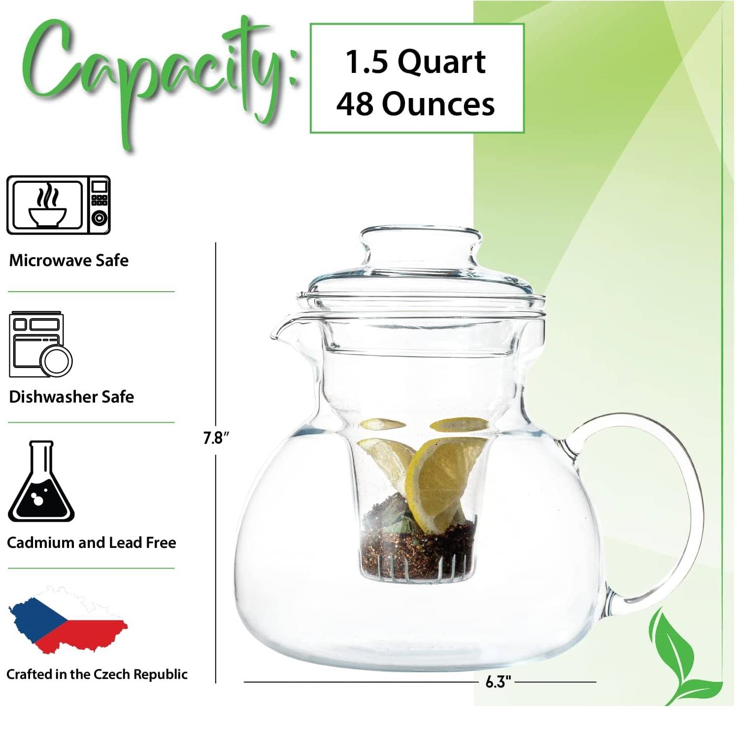 Bring teatime to the next level with this 1.5 Quart Clear Glass Teapot with Glass infuser. Fill your pot with loose leaf tea and watch as plain water slowly transforms into a delicious amber colored drink. To truly transform tea-time, use this pot with a blooming tea. Microwave and Stovetop Safe Glass: Heat your water in the glass pot directly on top of your electric stoves or gas stovetop. Please note that the handle will be hot after boiling tea so you should grab handle with pot holders or oven mitts to prevent scalding. 1.5 Quart Capacity: Teapot holds enough tea for approximately 6-7 cups. Invite a friend or family member and enjoy a relaxing drink together. (Please Note that the glass lid does not lock, and needs to be removed or held on to while pouring.) Short spout adds a touch of uniqueness and prevents dripping. Manufactured in the Czech Republic, our glassware does not absorb odors or flavors, and you do not need to worry about dangerous chemicals leaching into your tea. Borosilicate Glass is safe for both hot and cold liquids, and has a high thermal shock resistance. Also, refrigerator safe for saving tea for later, and microwave safe for easy reheating. Dishwasher safe for fast easy cleanup.